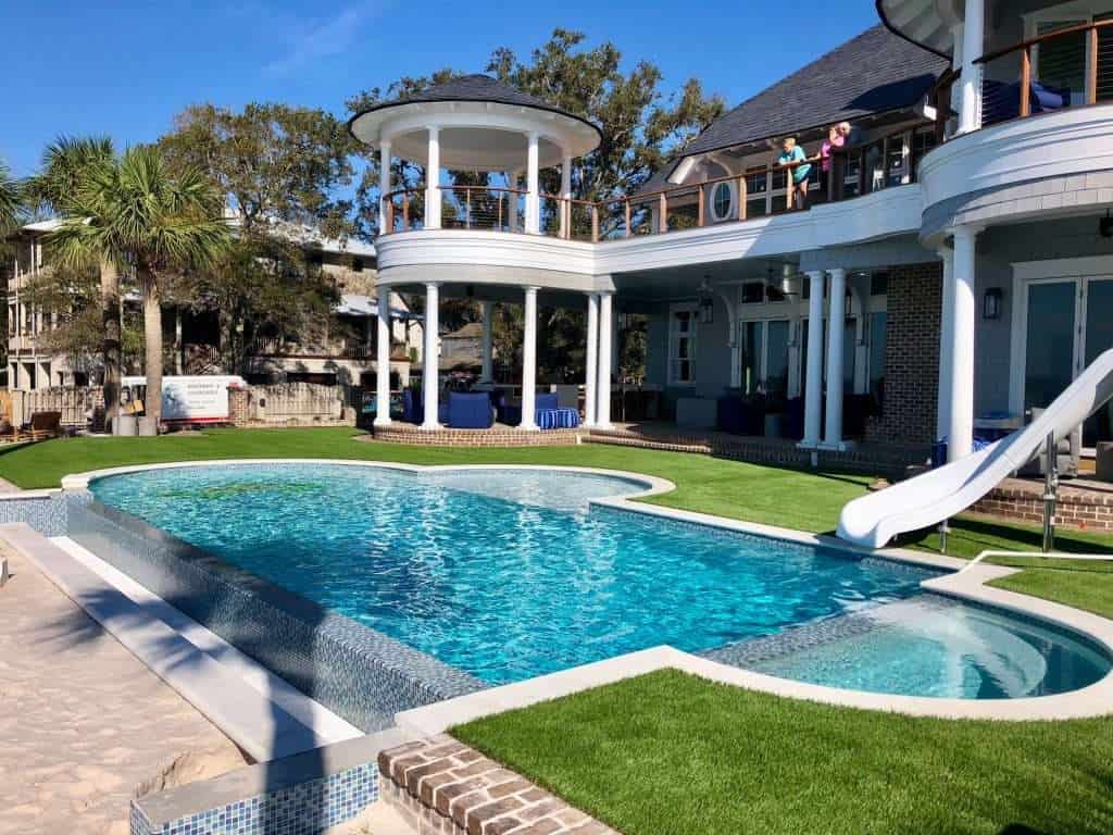 The synthetic grass is designed to provide a non-slip surface, increasing safety for wet feet. And luckily, it's also resistant to chlorine and other pool chemicals. The grass retains its vibrant color and texture despite frequent exposure to pool water. Artificial grass around the pool eliminates common issues associated with natural lawns as well, such as muddy patches and grass clippings in the water. Really, it makes poolside maintenance much easier.