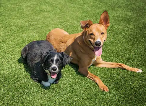 The best artificial grass for dogs is our K9 Deluxe and K9 Champion. They feature a lower pile height and excellent drainage, perfect for dogs.
